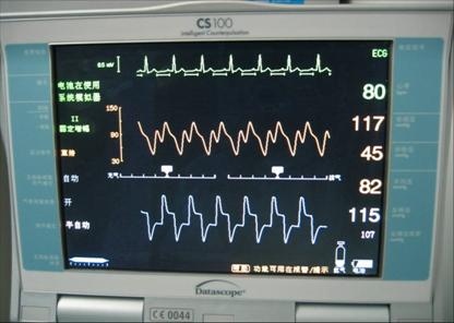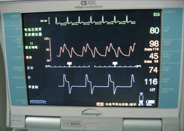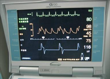持续监测心率、心律、反搏压、血压的变化。反搏期间应使病人的心率控制在 80 ~ 120 次 / 分,反搏压应高于病人血压 10 ~20mmHg. ,以获得满意的血流动力学效果。观察心电图的变化。 IABP 主要是依据 ECG 的 QRS 综合波中的 R 波触发球囊反搏,应选择 R 波清楚的导联,固定好心电图电极片,防止电极片脱落发生反搏终止。若出现心动过缓,心动过速,恶性心律失常时应及时处理。