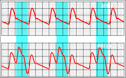 IABP 主要来看动脉压力波形,上面的波形是没有反搏时的动脉压力波形,下面的波形是1:2时动脉压力波形。可以看到在 DN 点,球囊充气,这时舒张压增高。在舒张末压点球囊放气,降低了舒张末压,降低了收缩压。 |