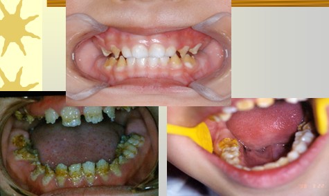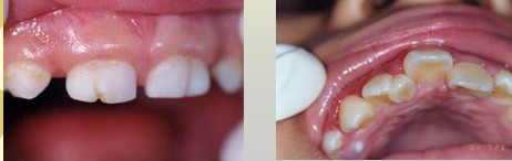 釉质发育不全:轻度:釉质色泽改变,呈暗白、不透明粉笔样的白垩状釉质。重度:牙面上出现带状、窝状的棕色凹陷。可能出现无釉质被覆,切缘变薄,牙尖消失。