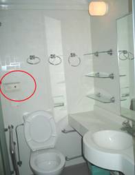 上图中所示为国内某家医院的病房的卫生间。 这个医院病房的卫生间很人性化,里面有很多护栏,这个护栏都是便于病人站起来。还可以看到一个细节,就是这个医院的卫生间的窗上安装了一个紧急呼叫铃。但是我们也可以发现,这个医院的呼叫铃有很多问题, 呼叫铃安装的位置是不便于患者,比如我们假设一个老人在卫生间里晕倒,或者滑倒或者摔倒,那么他肯定是在地上,实际上它的呼叫铃应该有一个垂直的线拉下来,从而便于患者呼叫。